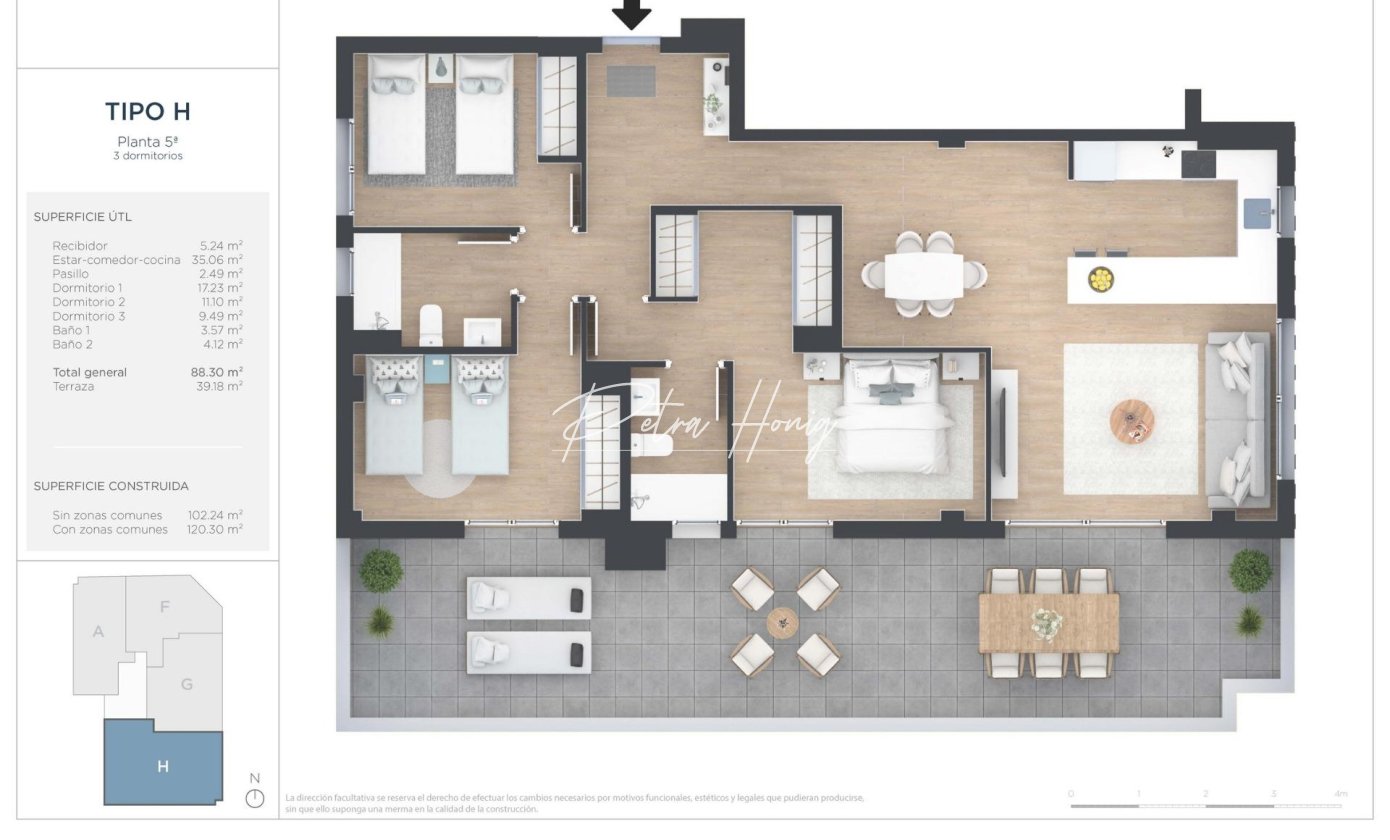 Lejligheden leveres med finish i høj kvalitet, herunder et køkken med keramisk kogeplade, ovn og emhætte, indbyggede skabe, forstærket sikkerhedsdør og aerotermisk system til varmt vand. Udvendigt tømrerarbejde har termisk adskilte aluminiumsrammer med dobbeltglas for forbedret isolering. Aircondition og opvarmning via varmepumpe sikrer komfort året rundt.