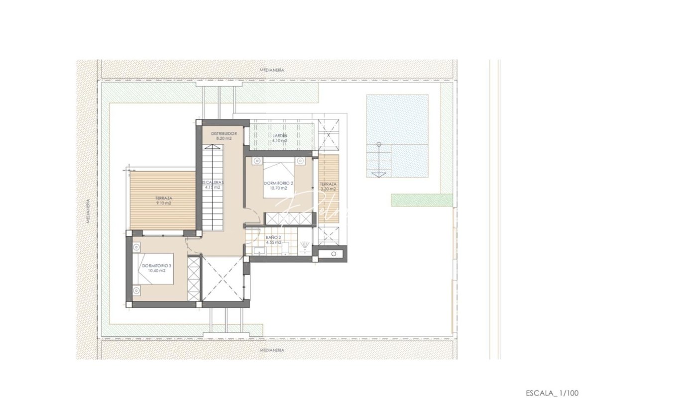 Tomtens utvendige innhegninger vil bli behandlet med de samme materialene som brukes i huset, noe som sikrer integrering i boligkomplekset.