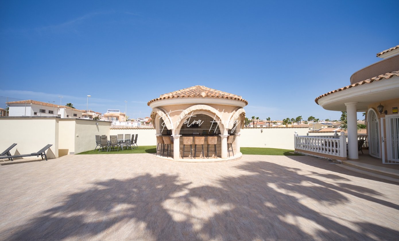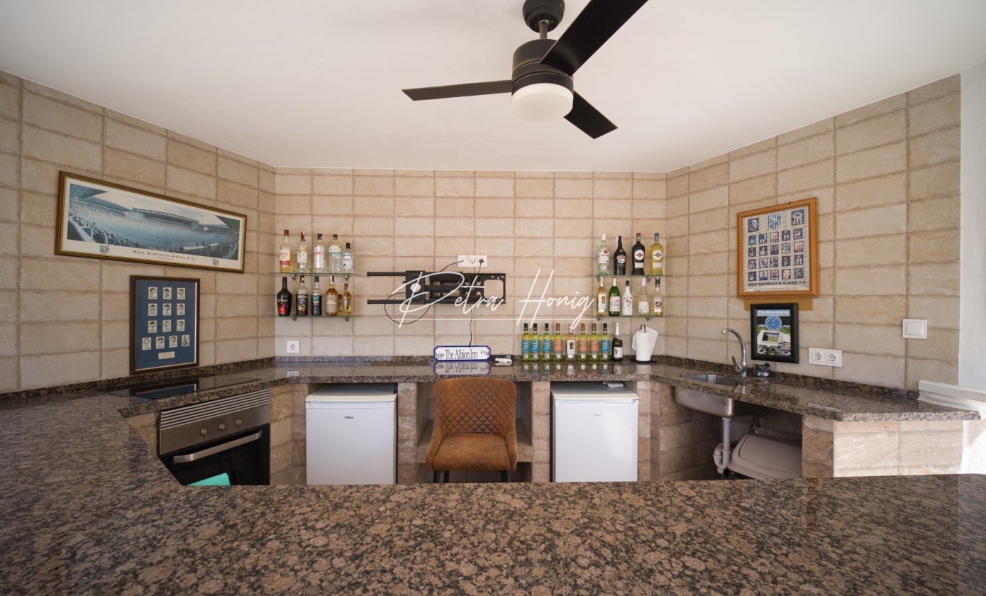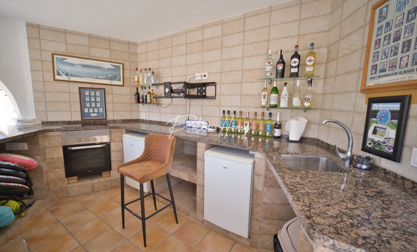 Outside, this home continues to impress. There are two covered terraces at the front of the villa, which are ideal for outdoor dining or relaxing in the shade. A charming pergola area, a well-equipped bar with TV and stools and a single garage with retractable roof.