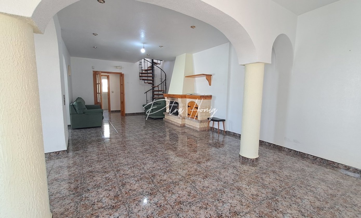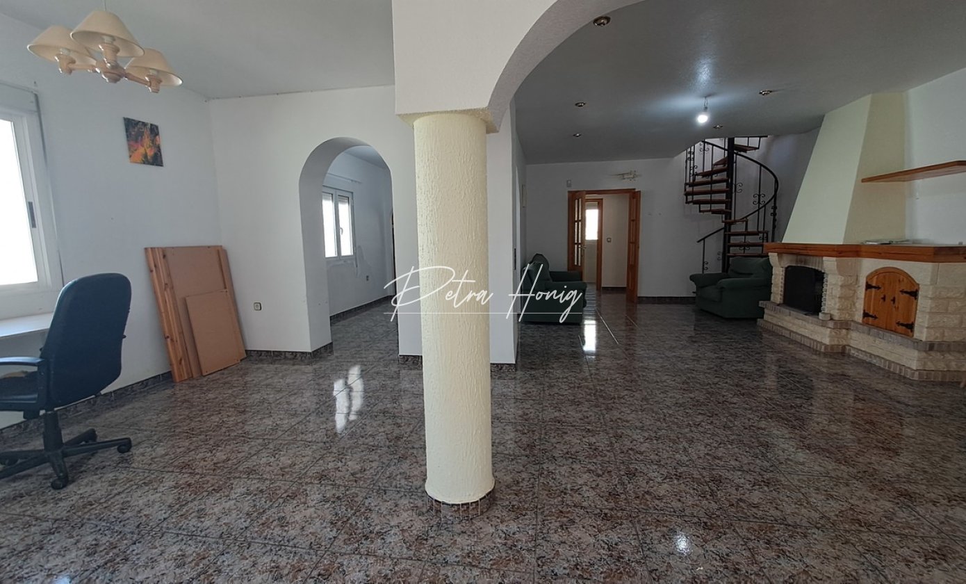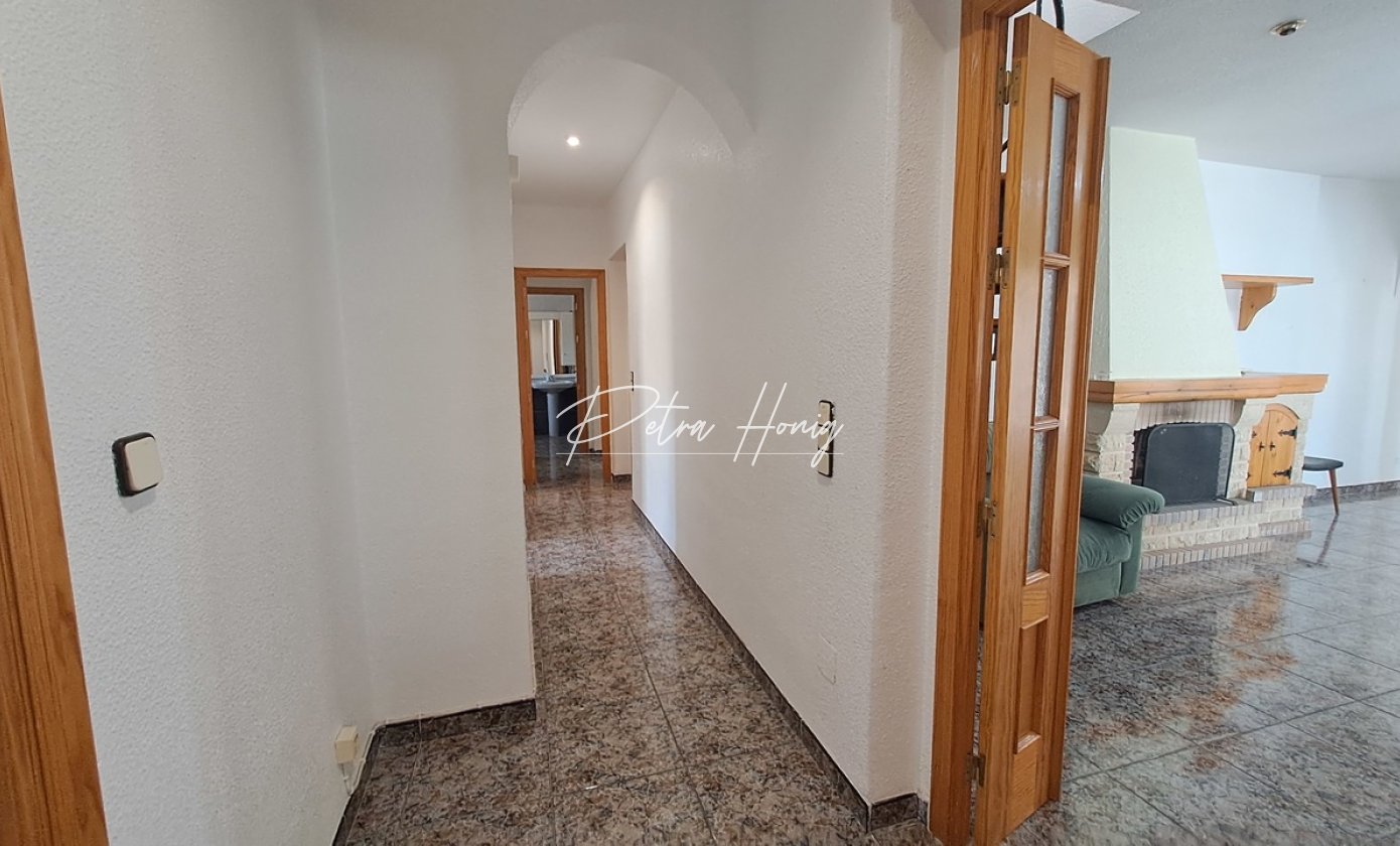 We present this villa located in Villamartin. When we enter into this property we can find a huge living room with fireplace. This living room is connected to the dinning room. And from there we go to a open kitchen with laundry room. There is a long corridor where we find four of the bedrooms with wardrobes, and two bathrooms whichs one of them has bathtub.
