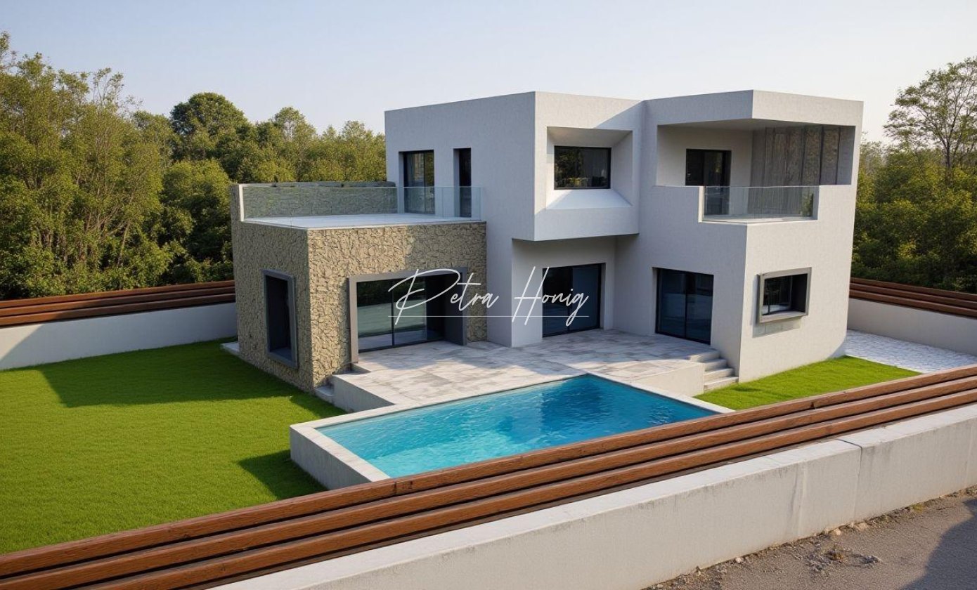 Modern fristående villa omgiven av natur