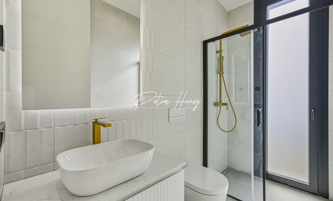 På bottenvåningen leder en välkomnande entréhall med inbyggd garderob till två sovrum med egna badrum, inklusive en mastersvit med fönsterdörrar som kan öppnas och vetter mot en fransk balkong och terrass. Det öppna vardagsrummet och matplatsen ansluter smidigt till en täckt pergolaterrass och en privat saltvattenpool.