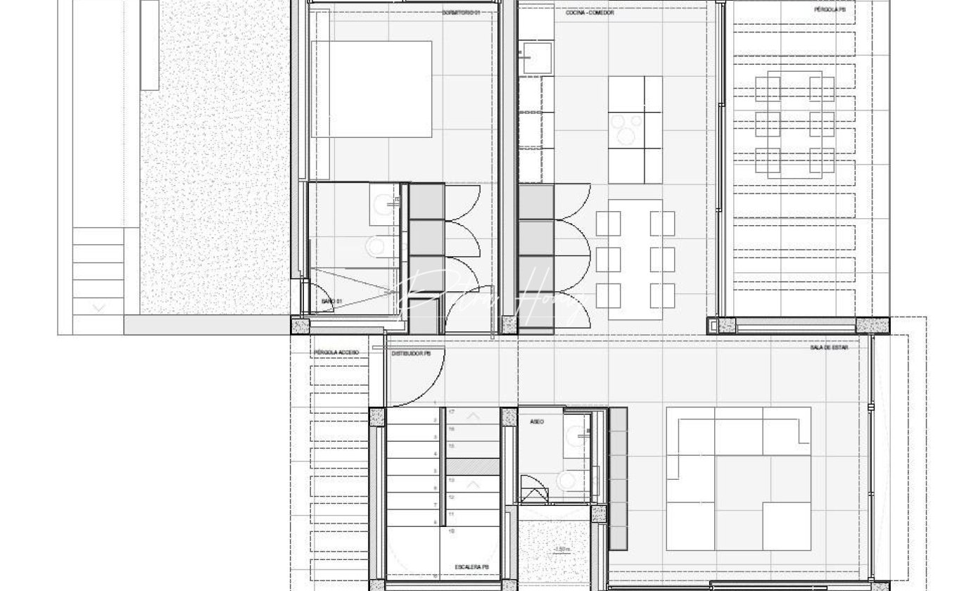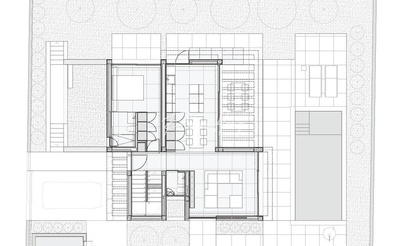 På bottenvåningen välkomnas du av en entréhall med inbyggd garderob och gästtoalett. På denna våning finns ett sovrum med eget badrum och fönster som kan öppnas från golv till tak och vetter mot en privat sidoterrass. Det ljusa vardagsrummet och matsalen i öppen planlösning ansluter direkt till en pergola-täckt terrass och den privata saltvattenpoolen, vilket skapar en harmonisk livsstil inomhus och utomhus.